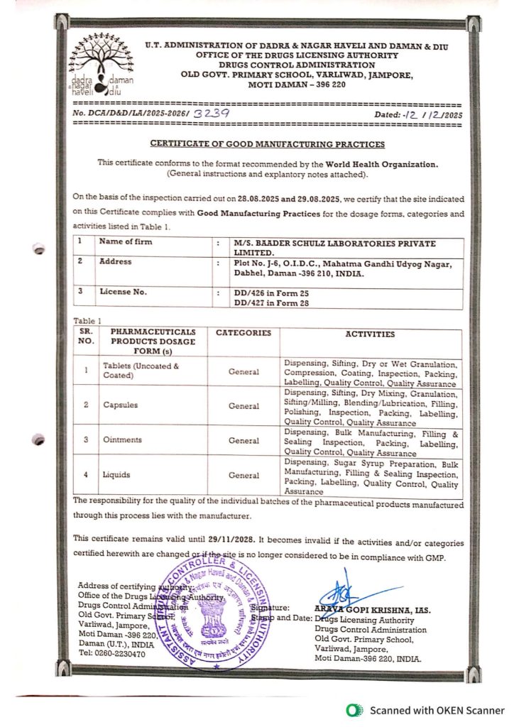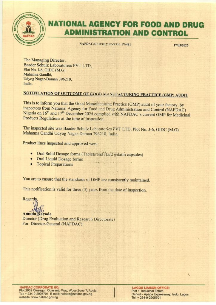 Baader Schulz Laboratories Pvt. Ltd. (BSL) delivers trusted pharmaceutical and veterinary healthcare solutions. Headquartered in Mumbai with a 60,000 sq.ft. WHO-GMP and ISO-certified plant in Daman, we serve domestic and international markets through manufacturing, marketing, and contract services. With operations across 15+ countries and a new facility underway, BSL remains committed to quality, innovation, and global care.